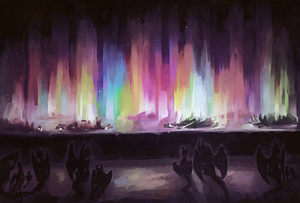 In the Wake, after the Votary (if present) speaks the Rites, the deceased’s eldest descendant, or nearest family member, releases their element or magic as gently as they can, aiming for the few spirit gems laid around the deceased. Then the second eldest joins, until all (if any) children have given their energy. The more dragons who participate, the brighter and taller the ‘aurora’.